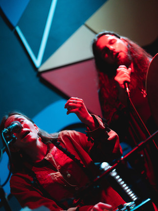 I can speak about one of the songs I performed at your event, called "Gods In Catatonia", it was the second song of our set. Gods In Catatonia unfolds a narrative of a surrealist, animist, oneiric realm, of the journey of the soul, from earthbound body that witnesses the depths of pain and beauty, the paradox and polarities of existence, to the process of the deathly rebirth,or return, or resurrection, transcendence to boundless spirit with an axis to aeternum, the complexity of the multidimensional cosmos revealed. The name Gods In Catatonia, reflects the gnosis of the limitless divinity within all life encased in earthbound human limitation, yet witnessing glimpses of the infinite micro - macro cosmic multi layered life phenomena unfold, to a point of entering what to society can be delirium; a liminal dreamscape that paradoxically holds more truth in its meaningful meaninglessness than reality as we know it.